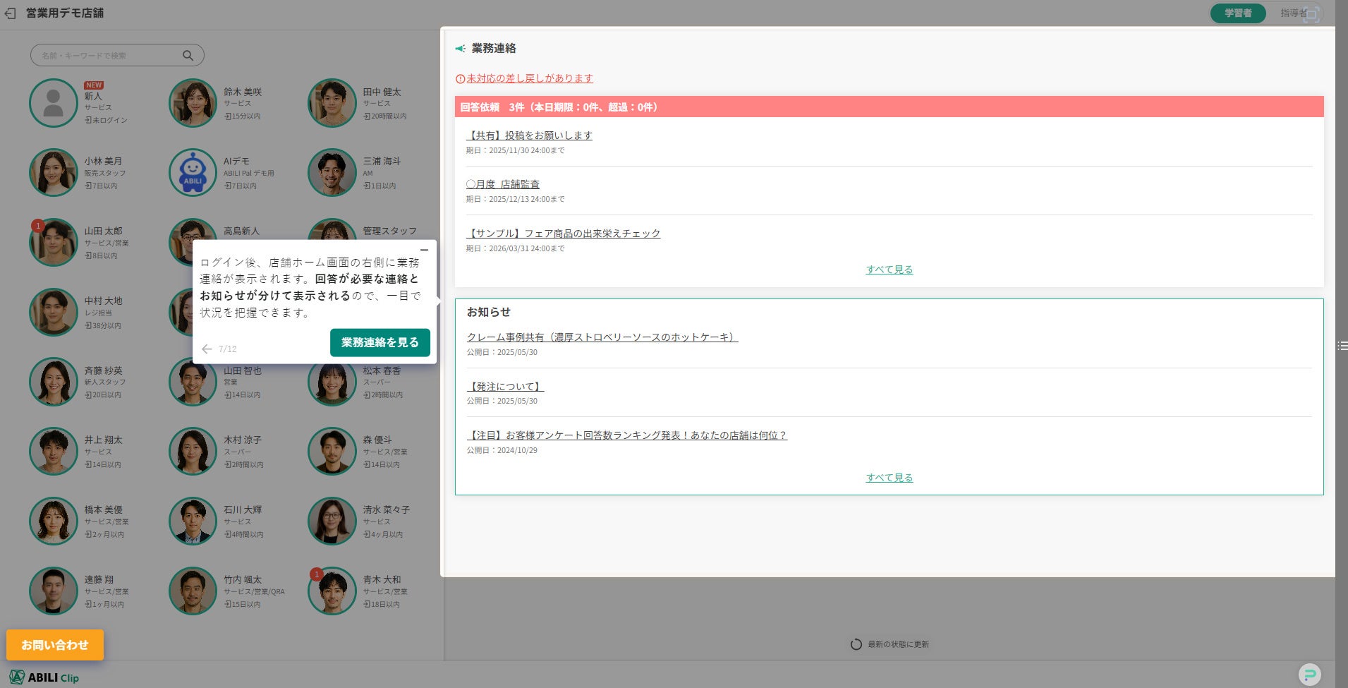 クリックするだけでサービス内ツアーが始まるインタラクティブなオンラインデモを実装しました。動画や静止画では伝えきれない操作性や活用イメージを、お客様自身のペースで体験いただけます。