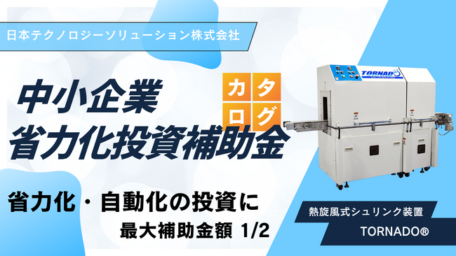 日本テクノロジーソリューション株式会社(本社:兵庫県、代表取締役社長:岡田耕治)が製造・販売する「熱旋風式シュリンク装置 TORNADO(R)」が、経済産業省・中小企業庁が推進する「中小企業省力化投資補助金(カタログ型)」の対象製品として採択・掲載されました。