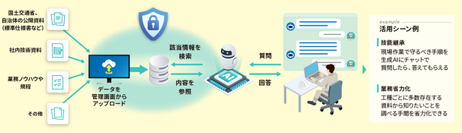 - 国土交通省や自治体が公開している標準仕様書、自社の技術資料、業務ノウハウや規程などのファイルを管理画面からドラッグアンドドロップでアップロードするだけで、生成AIを用いたナレッジ検索が可能