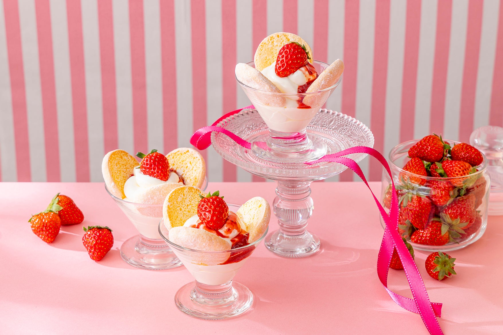ブランドいちご食べ比べ~毎日2種食べ放題(あまおう、紅ほっぺ、とちあいか、とちおとめ、きらぴ香など)、プティ・パレス・オブ・ストロベリー、イタリア産マスカルポーネとストロベリーのクレームブリュレ、千葉県産ミルクといちごのクリーミープリン など