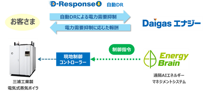 大阪ガス株式会社(代表取締役社長:藤原正隆、以下「大阪ガス」)と大阪ガスの100%子会社のDaigasエナジー株式会社(代表取締役社長:福谷博善、以下「Daigasエナジー」)は、三浦工業株式会社(代表取締役 社長執行役員 CEO兼CTO:米田剛、以下「三浦工業」)と共同で、Daigasグループの遠隔AIエネルギーマネジメントシステム「Energy Brain」と三浦工業製の電気式蒸気ボイラ(以下「電気ボイラ」)を連携することで、自動デマンドレスポンス(以下「DR」)制御の実証を完了しました。