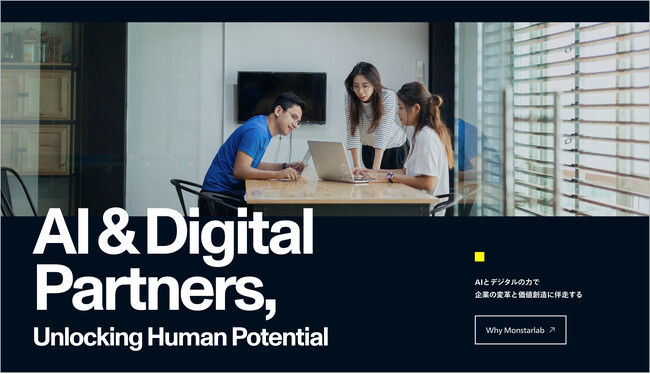 AIとデジタルの力で企業の変革と価値創造に伴走する「AI & Digital Partners」の株式会社モンスターラボ(本社:東京都渋谷区、代表取締役社長:鮄川 宏樹(いながわ ひろき)、以下「モンスターラボ」)は、この度、新たなグローバルブランドメッセージ「AI & Digital Partners, Unlocking Human Potential」を策定し、当社コーポレートサイトのキービジュアルを刷新いたしました。
