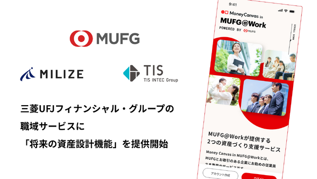株式会社MILIZE(本社:東京都港区、代表取締役社長:田中 徹、以下「MILIZE」)は、株式会社三菱UFJフィナンシャル・グループ(本社:東京都千代田区、代表執行役社長:亀澤 宏規、以下「三菱UFJフィナンシャル・グループ」)が取引企業の従業員向けに展開する職域サービス「Money Canvas in MUFG@Work」において、TIS株式会社(本社:東京都新宿区、代表取締役社長:岡本 安史、以下「TIS」)とともに将来の資産設計機能を提供開始したことをお知らせします。本機能は、将来の家計や資産の見通しを可視化し、利用者一人ひとりの資産形成を支援するものです。