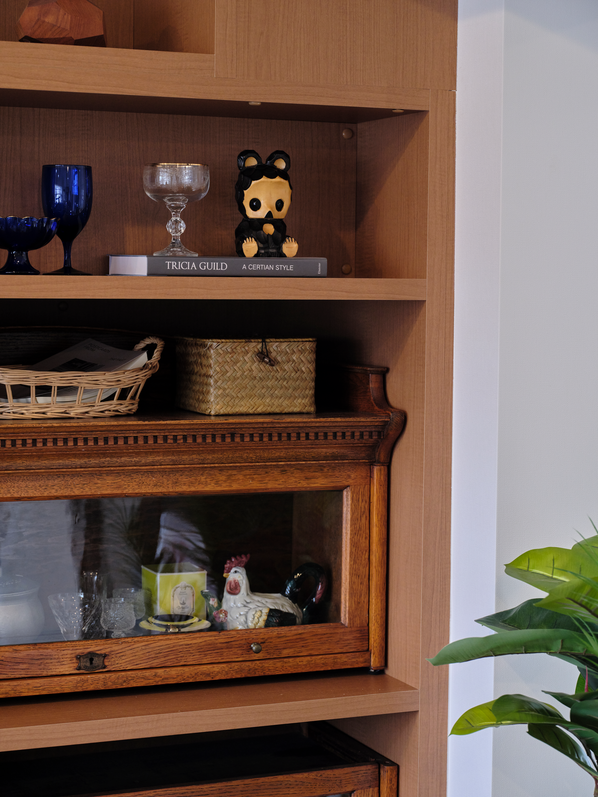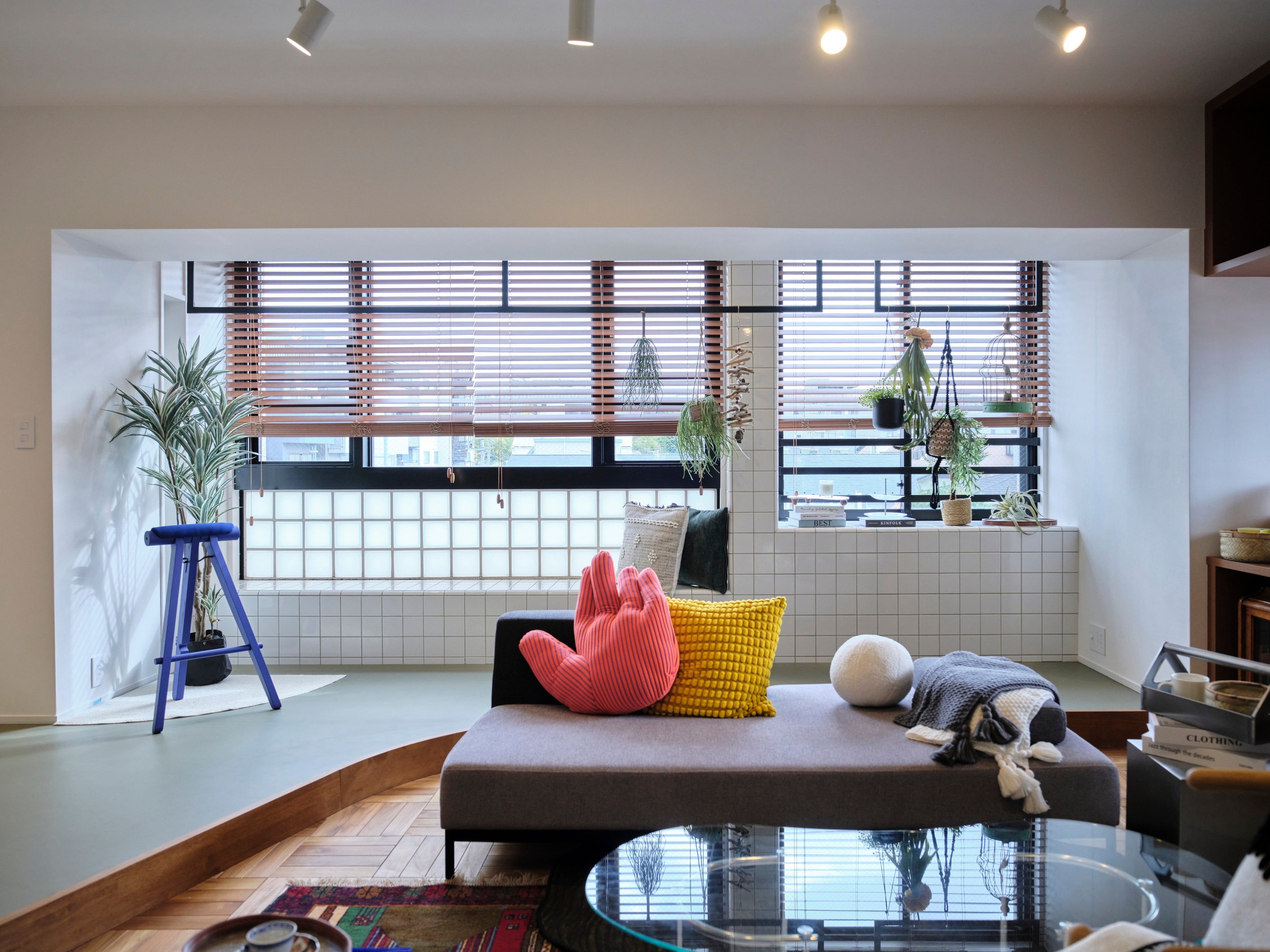 - 好きを集めて、囲まれて。古今東西の質感がミックスされたリビングリビングは、部屋の中心地であり、部屋の印象を大きく左右します。壁一面に広がる飾り棚には、もともとの窓を活かしつつ、ヨーロッパのアンティーク什器を埋め込みました。また、多治見のデッドストックタイルを使った窓台を設けるなど、一つの空間に多層的な表情を持たせています。