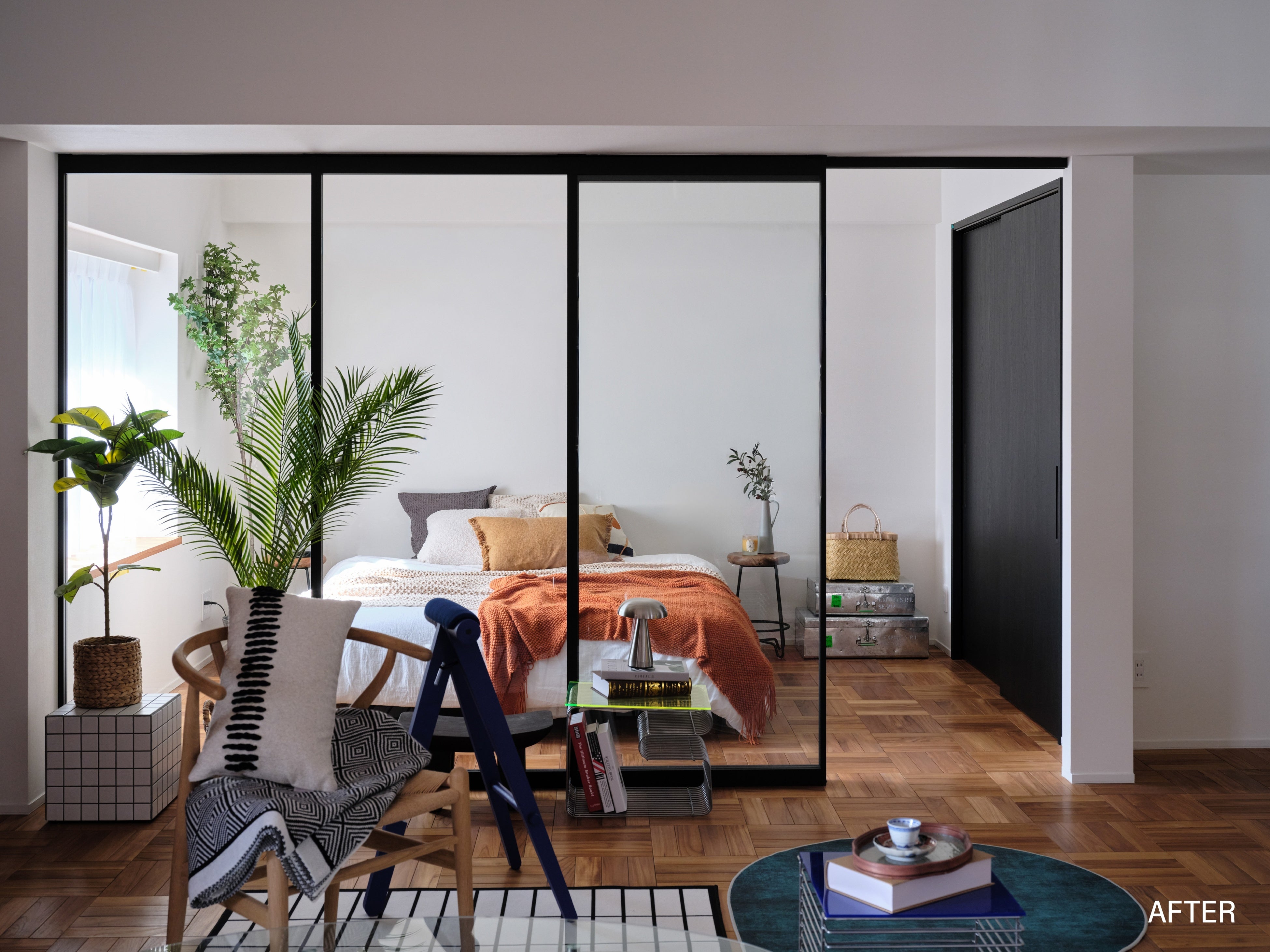 扉を閉じるのではなく開き、空間を仕切るのではなくつなげる。各所の開き戸を引き戸に置き換えることで、空間のロスを減らし、広がりを作りました。リビングと隣接するベッドルームも、ガラスの引き戸にすることで、気持ちの良い採光を活かしつつ、程よく空間を仕切りました。