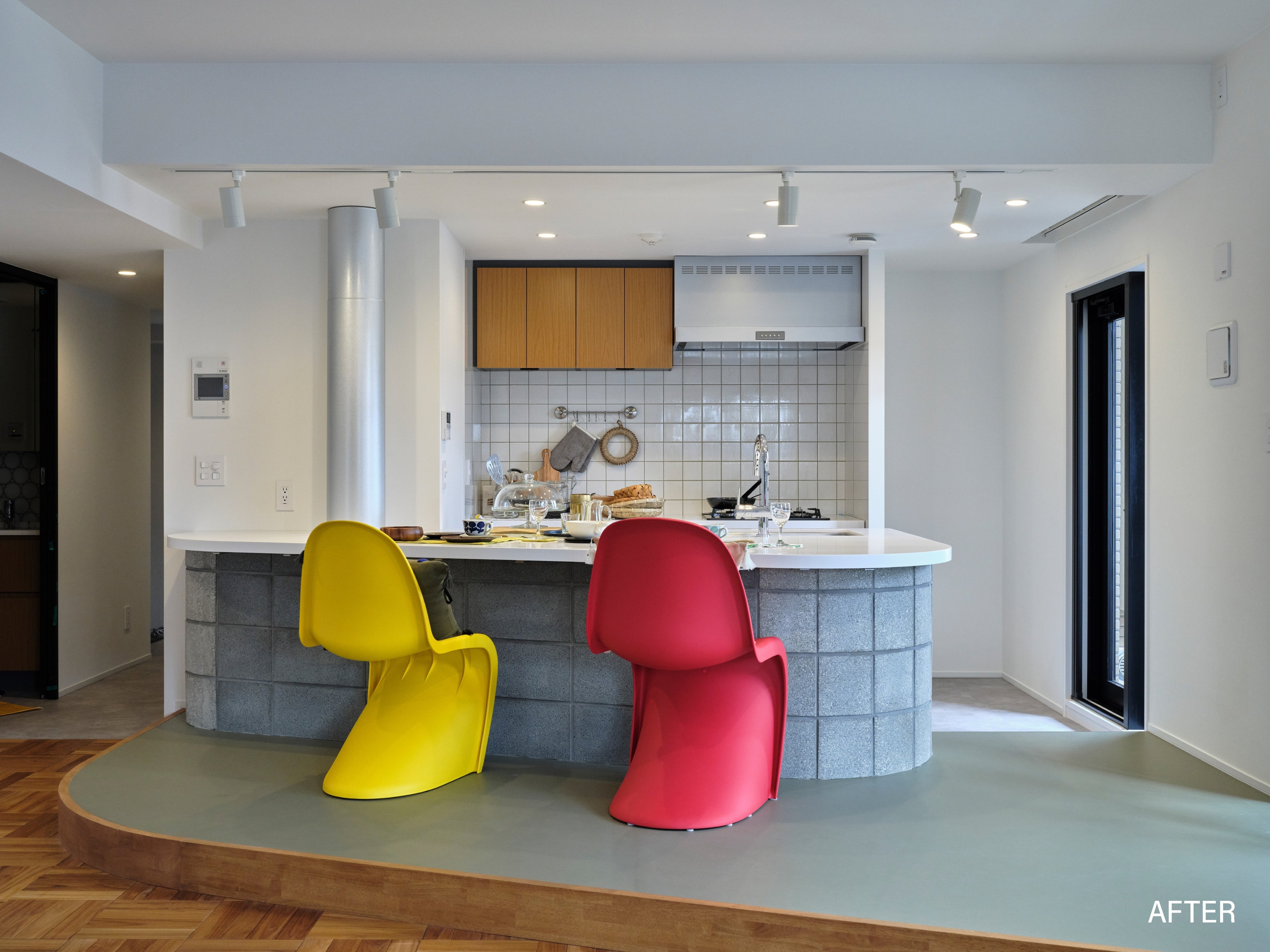 やわらかな曲線を活かしたキッチンには、ダイニングに向かう形でカウンターをもうけました。キッチンはリビングよりも床を下げることで、料理をする人、テーブルに座る人の視線が自然に交わされるような構成にしています。カウンターキッチンの囲いには、テラゾーのように磨き上げたモルタルブロックを重ね、建材も自由度高く選んでいます。ダイニングにS字型の段差を配置し、壁を造らずにゆるやかに空間の仕切りを作っています。