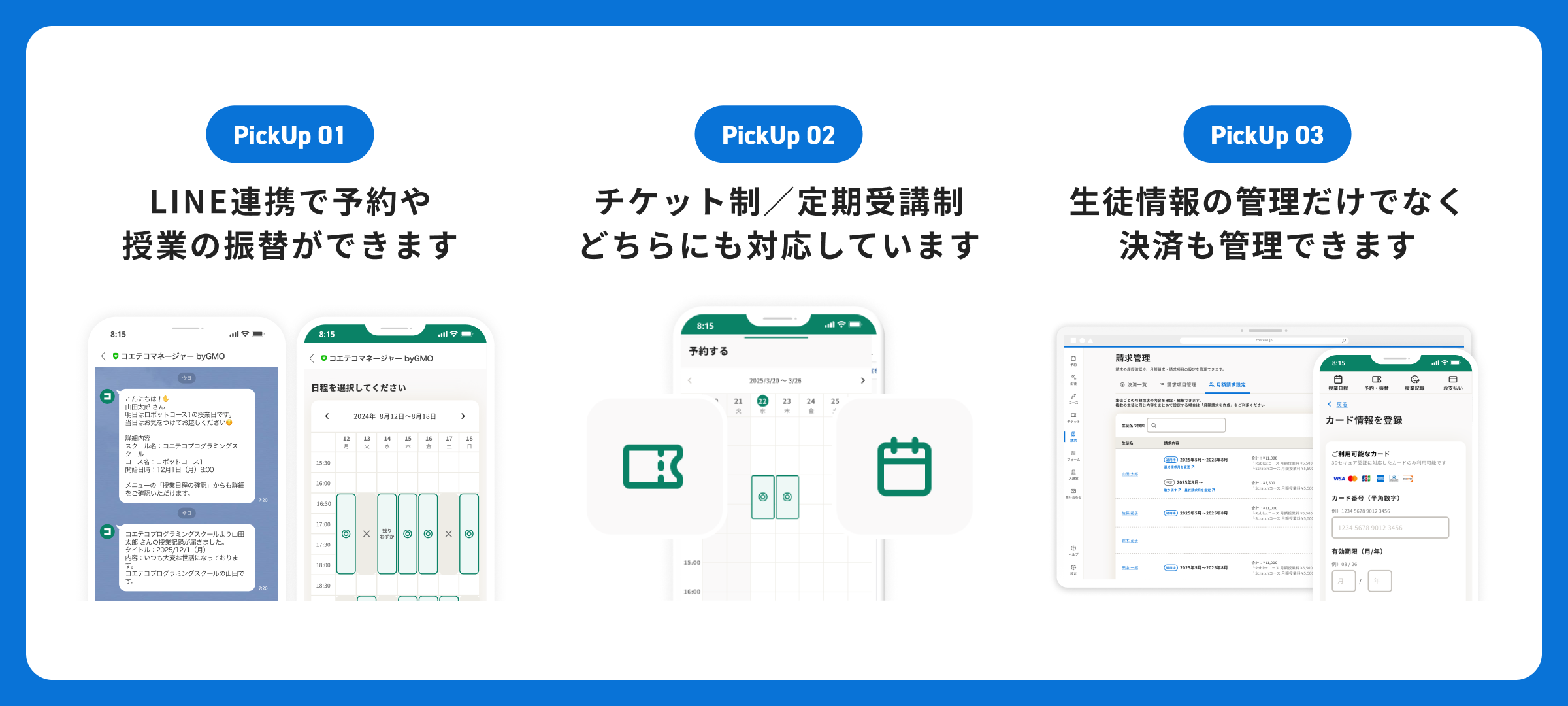「コエテコマネージャー byGMO」は、体験授業の受付から入会手続き、生徒管理、欠席・振替処理、月謝決済まで、教室運営に必要な業務を一つにまとめて管理できるオールインワン型管理システムです。これまで複数のツールを使い分けていた煩雑な運営プロセスを一本化し、教室運営の効率化と保護者満足度の向上を同時に実現します。