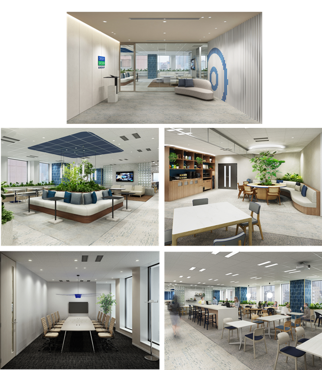 部門を超えた交流を促す共用スペースを構築いたしました。三井不動産グループの三井デザインテック株式会社(本社:東京都中央区、代表取締役社長:村元 祐介)と共同で企画・設計を行い、創造性を刺激する空間づくりを実現しました。