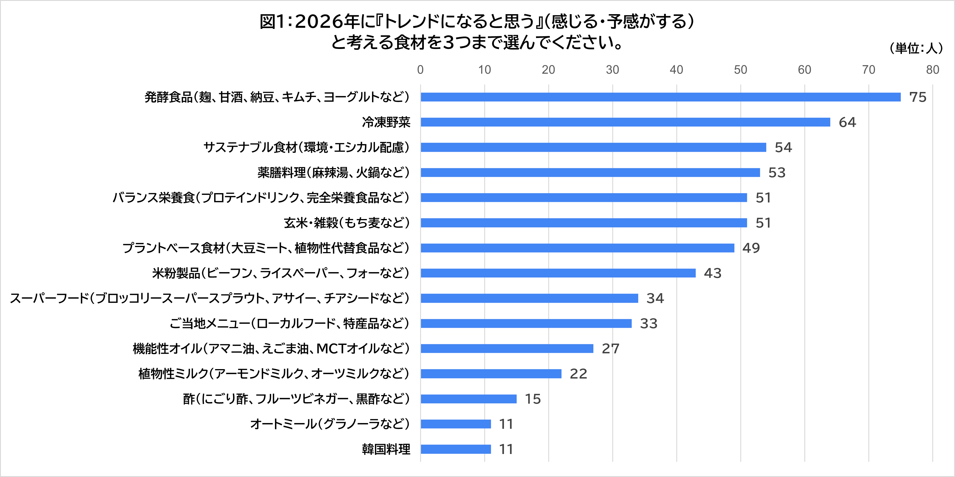 2026年に「トレンドになると思う」(感じる・予感がする)と考える食材は、麹、甘酒、キムチ、ヨーグルトなどの「発酵食品」(75人)が最も多く、続いて「冷凍野菜」(64人)、「サステナブル食材※」(54人)がランクイン。食材選びにおいて、“からだによい”だけでなく“手間を省ける”、“環境にやさしい”といった、多面的な価値観が重視される結果となりました。