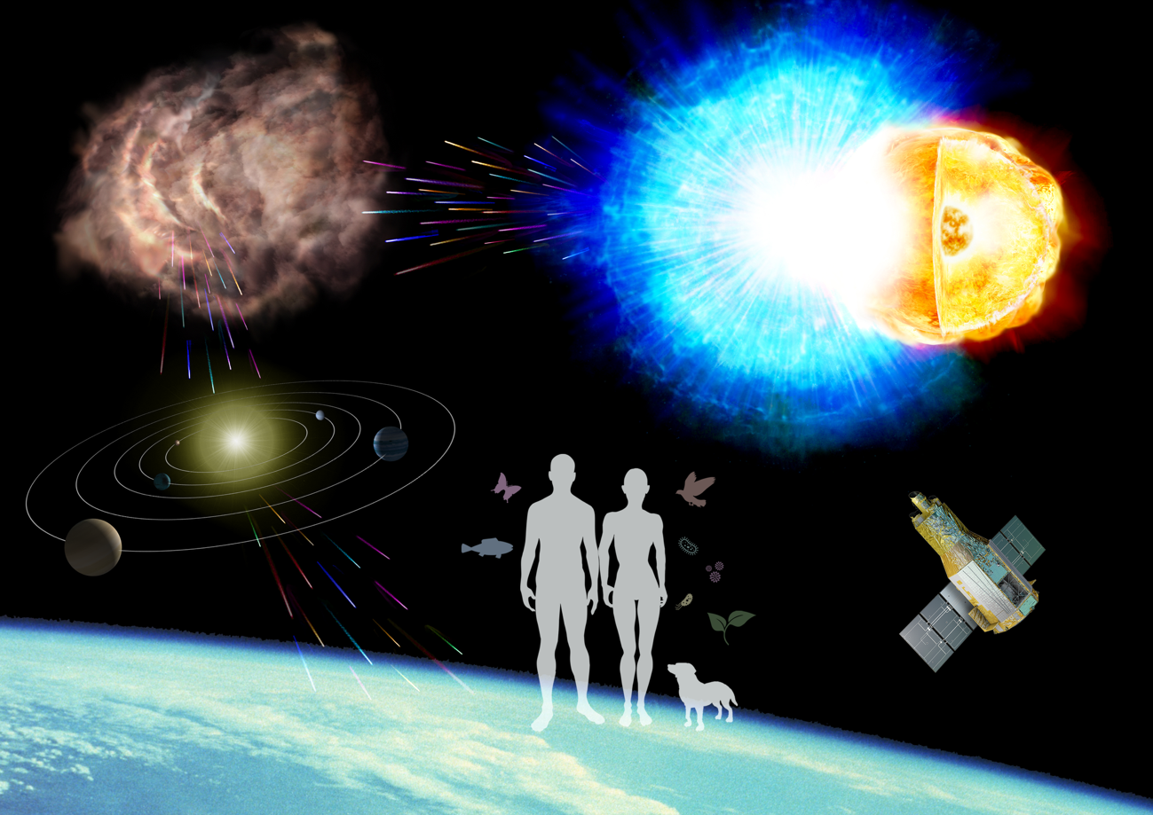 星は一見静かに輝いているように見えますが、内部では「核燃焼層」と呼ばれる核融合領域がいくつも重なり合い、それぞれが激しい対流を生み出しています。今回の観測結果を理論モデルと比較したところ、自転の速い星や連星として別の星と相互作用していた星、あるいは異なる核燃焼層が混ざり合う「シェルマージャー」という現象を起こしていた星のモデルが、観測値とよく一致しました。 これらの現象は、星の内部を激しくかき乱し、元素を通常より効率的に作り出すことが理論的に示唆されてきましたが、本研究によって初めてその観測的な証拠を掴みました。つまり、塩素やカリウムといった生命の材料は、こうした「活動的な星たち」によって生み出され、宇宙にばら撒かれてきた可能性が高いのです。今回の成果は、宇宙における「生命元素」の起源を解く重要な手がかりです。塩素は生命活動に欠かせない電解質の一つであり、カリウムは神経や筋肉の働きに不可欠な元素です。これらが豊富に存在する地球環境がどのように形成されたのかを理解するためには、その源である星の中で何が起きていたのかを明らかにする必要があります。 XRISMの観測によって、初めて「星がどのようにして生命や地球に必要な元素を宇宙に送り出したか」を具体的に示すことができました (図4)。