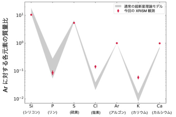 図3:XRISMによるカシオペア座Aの元素量の測定結果 (赤データ点) と理論モデル (灰色領域) との比較。通常の超新星モデルではカシオペア座Aの元素量、中でも塩素とカリウムの量を説明できないことを発見。(C)明治大学/京都大学