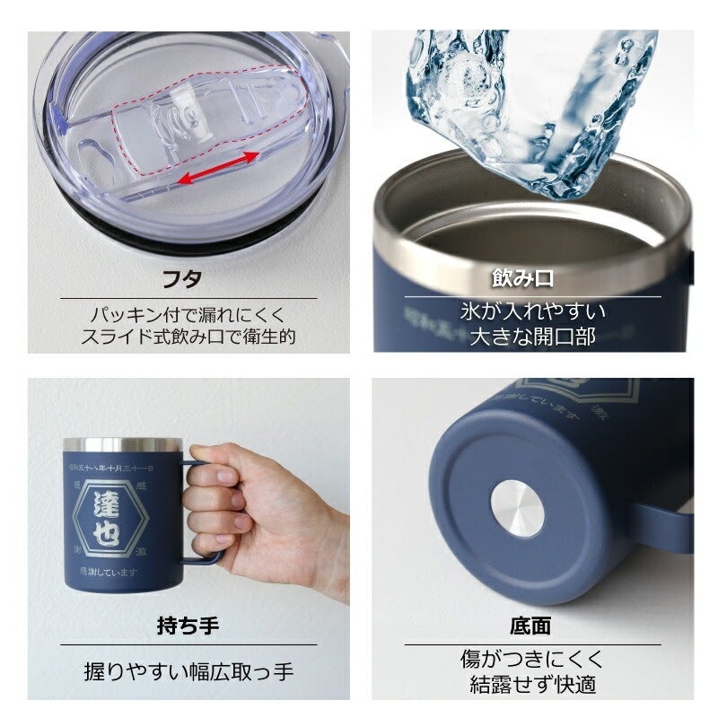 たっぷり入る350ml~400mlのサイズは、日々の水分補給に最適。口が大きく、カップスープや氷を入れる際もストレスフリーです。