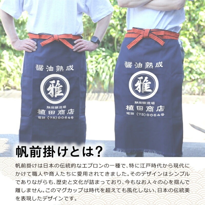 本製品は、元々、醸造所の製品名や創業年を記し、**「自分が携わるものへの自信と誇り」**を形にした帆前掛けにインスパイアされています。粋な家具職人が在籍する当社が、その魂を込めて、毎日の食卓を飾るマグカップに再現しました。