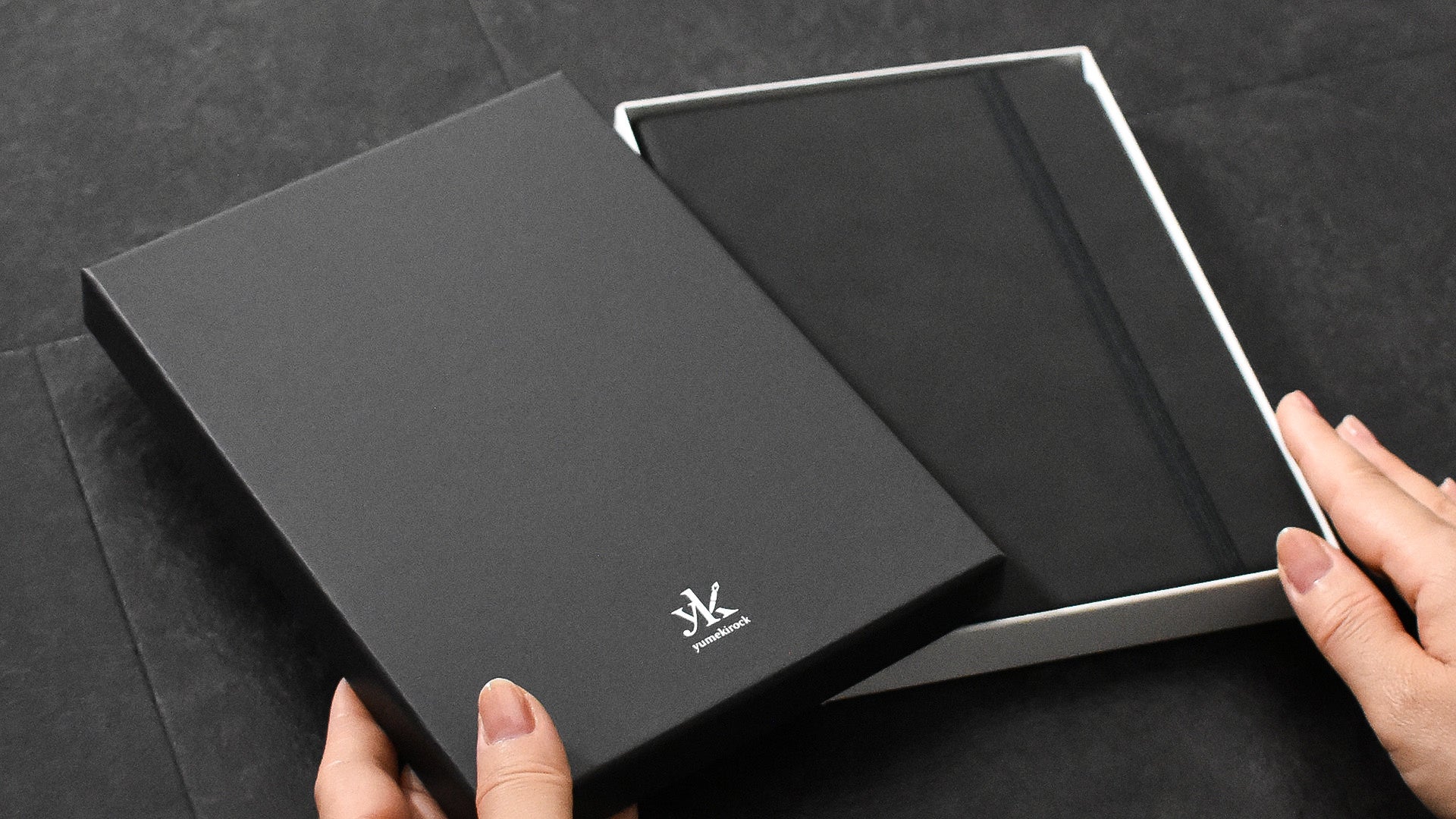 仕様: 厚口用紙、ノンブル入り、糸かがり綴じ、マットPU表紙、同色ゴムバンド、特注ギフト箱入り