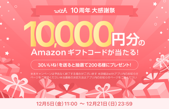 10周年イヤーを迎える今年は、日頃の感謝を込めて“出会いの一歩を応援する”キャンペーンを複数回にわたり展開してまいります。本キャンペーンでは、Amazonギフトコード1万円分が200名様に当たる(総額200万円相当)豪華企画をご用意し、「with」を現在ご利用中の方はもちろん、しばらく離れていた方、これから使ってみたい方にも楽しんでいただける企画として実施いたします。