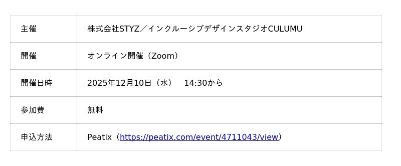 インクルーシブデザインスタジオCULUMU(運営:株式会社STYZ、本社:東京都渋谷区、代表取締役:田中辰也、以下「CULUMU」)は、オンラインセミナーを2025年12月10日(水)14時30分から開催します。