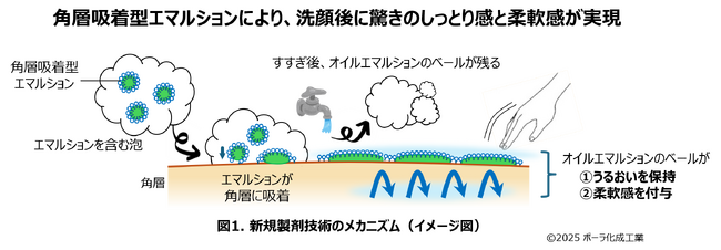洗顔料は、皮脂や汚れとともに肌の生体保湿成分も洗い流してしまうことがあり、洗顔後に乾燥やつっぱりを感じやすいという課題がありました。保湿成分などを配合しても十分に肌に残らず、しっとり感を求める声が多く寄せられていました(補足資料1)。そんな中ポーラ化成工業では、肌表面の角層に吸着する性質を持つ天然由来保水成分「Mal2Far」を洗顔後の肌に残存させ保水力を高める技術を開発してきました(※1)。本研究では、うるおい実感をさらに向上させようと、「Mal2Far」でエモリエントオイル(※2)を乳化し、洗顔料に配合する新技術(角層吸着型エマルション)を開発しました。すすぎ後も肌にエマルションのベールが残ることで(補足資料2)、驚くほどのしっとり感や柔軟感を与えます(図1)。