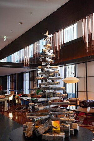 クリスマスツリーの足元に並ぶギフトボックスには、印刷工程で生まれる「損紙」と実際の新聞紙をアップサイクルしたものが混在しています。役目を終えるはずだった紙が“贈り物”として再び価値を宿す姿は、この季節ならではの温かな希望を象徴しています。さらに、ツリーのトップで輝く星は、ホテルが新たな一歩を踏み出した瞬間を伝える紙面から制作されたもの。過去の記録が、未来への道標として光を放ちます。