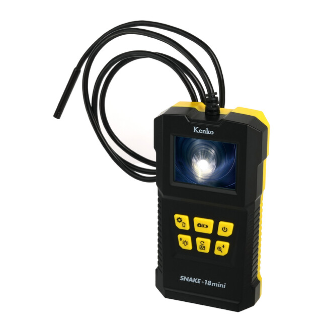 Kenko SNAKE-18miniは手の届かない狭い所や高い所でも簡単に動画・静止画で撮影することができるフレキシブルチューブカメラです。防塵・防水仕様なので水回りでの撮影が可能です。また、フレキシブルチューブ先端にLEDライトが付いているため、暗い所でも使用できます。