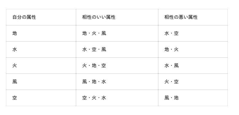 それぞれの属性別の「相性の良い属性」「相性の悪い属性」は以下の通りです。