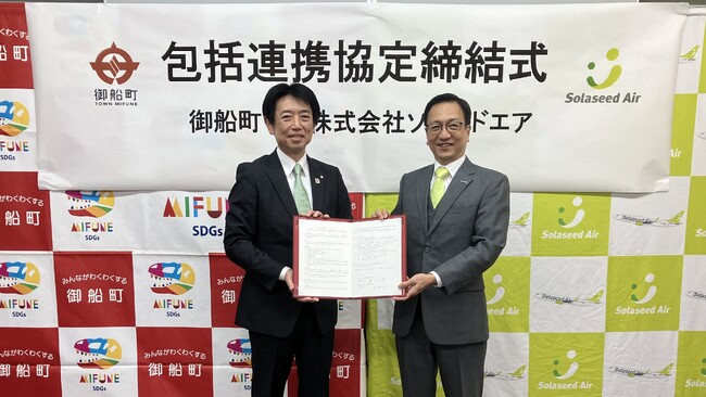 熊本県御船町(町長:藤木 正幸 以下、御船町)と株式会社ソラシドエア(本社:宮崎県宮崎市 代表取締役社長:山岐 真作 以下、ソラシドエア)とは、2025年12月5日(金)に緊密な相互連携と協働による活動を推進し、地域課題に迅速かつ適切に対応し、御船町の更なる発展に向けた取組に資することを目的として「熊本地震から10年の節目」を契機とした地域課題の解決に関する包括連携協定を締結いたしました。