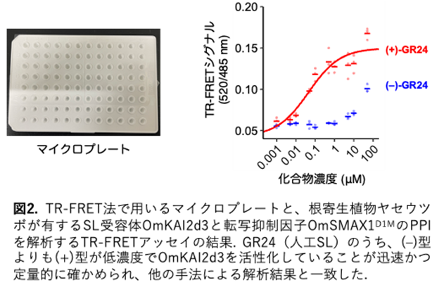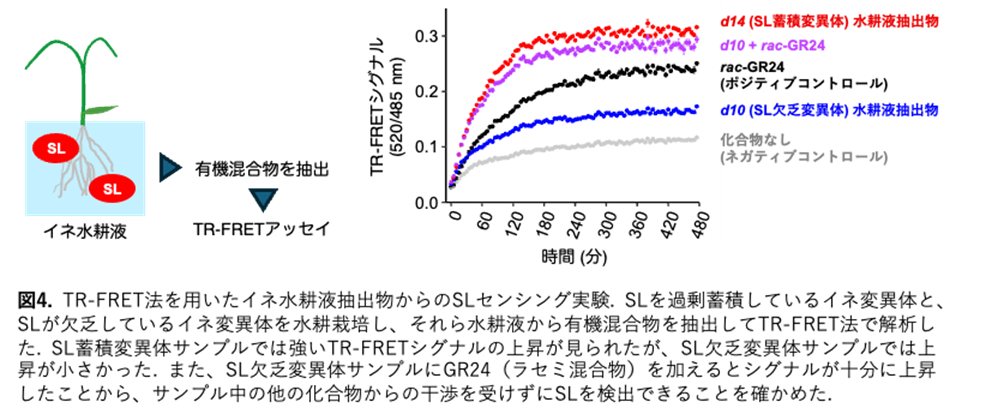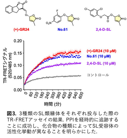 本研究グループは、SLが誘導するPPIを迅速かつ定量的に測定する手法を開発することで、SLやSL受容体の詳細な機能解析や、SL様活性を示す新たな分子を探索することが可能になると考えました。そこで、定量性・スループット性・頑健性に優れ、経時的に変化を追跡することができる時間分解Forster共鳴エネルギー移動※3(Time-Resolved Forster Resonance Energy Transfer; TR-FRET)を利用したPPI解析法を採用しました。具体的には、SL受容体へ蛍光タンパク質mEGFPを融合し、MAX2もしくはSMAX1/SMXLを発光性テルビウム(Tb)錯体で標識することで、両者が近接した際にTb錯体からmEGFPへのFRETが生じるようにデザインしました。実際の実験と解析は、タンパク質やリガンドをマイクロプレート内で混合し、mEGFPとTb錯体の蛍光強度を同時測定して比を取るという非常に簡便な操作で完結します(図1)。この方法によって、さまざまなSL類縁体の活性や、受容体のSLに対する感受性を評価することに成功しました。また、PPI誘導の時間変化を追跡することにも成功し、この特性を活かした機能解析が可能になりました(図2)。さらに、TR-FRETが夾雑物の影響を受けにくい利点を活かし、イネの根から分泌された有機混合物をTR-FRET法で調べることで、分泌物中に含まれるSLを特異的に検出することに成功しました(図3)。