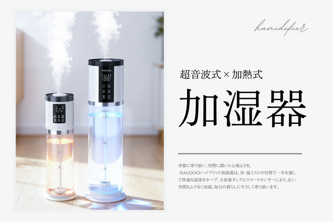 HAGOOGIは、加熱式と超音波式を組み合わせたハイブリッド加湿方式を採用した「ハイブリッド加湿器」を発売いたしました。