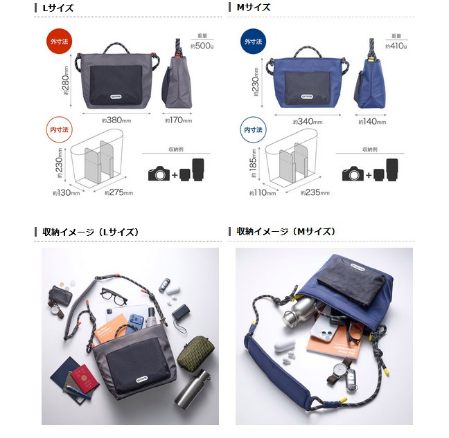 Lサイズはレンズ付きミラーレス一眼カメラと70-200mm F2.8クラスの交換レンズ1本などの収納が可能な十分な容量を、Mサイズには標準ズームレンズを装着したミラーレス一眼カメラと交換レンズや小物類の収納が可能です。