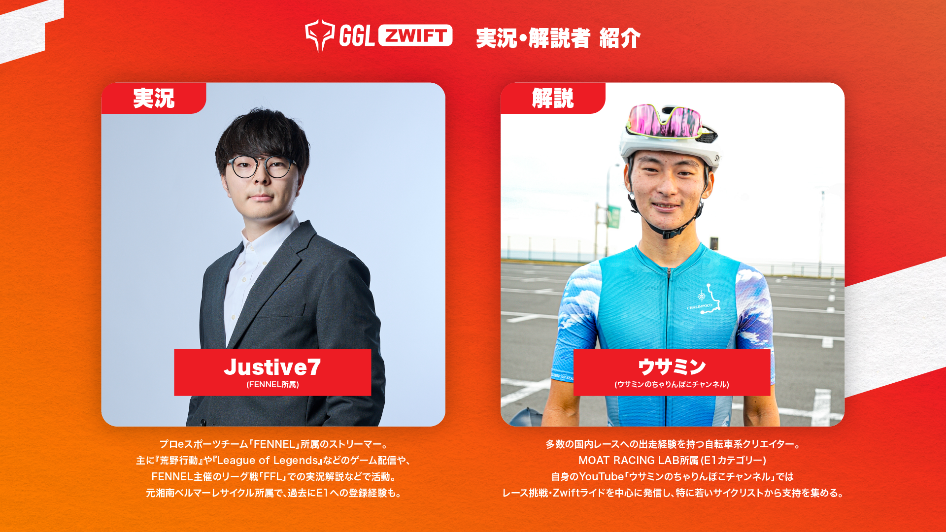 実況にプロeスポーツチーム所属のストリーマーであるJustive7氏、解説に人気自転車系クリエイターのウサミン氏(ウサミンのちゃりんぽこチャンネル)をお迎えし、視聴者も楽しめる新感覚バーチャルサイクリングイベントとして実施します。