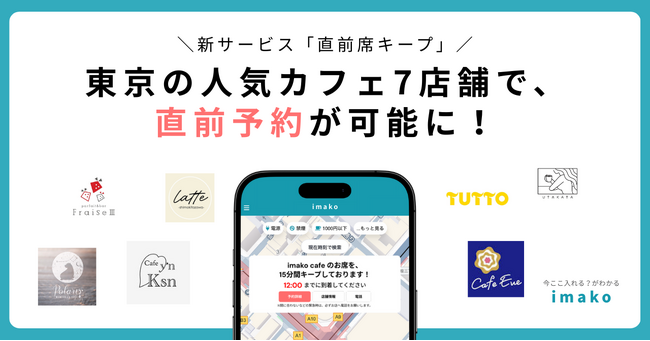 株式会社imako(本社:東京都渋谷区、代表取締役:浜田真衣)が運営するカフェ混雑情報マップ「imako(いまこ)」(https://app.imakoapp.com/?&utm_source=prtimes&utm_medium=tokyoarea)は、吉祥寺、下北沢、三軒茶屋、自由が丘、清澄白河エリアの人気カフェ7店舗で、マップ上から気になるカフェの席を15分間確保できる新サービス「直前席キープ」の導入を開始したことをお知らせします。