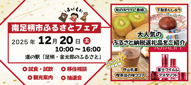 南足柄市では、道の駅「足柄・金太郎のふるさと」で来場者に対して対面でのふるさと納税返礼品の紹介などを行う、南足柄市ふるさとフェアを12月20日(土曜日)に開催します。