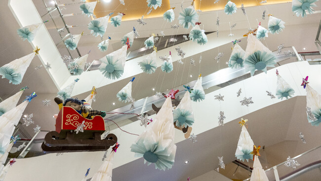 「みんなでつくるクリスマスツリー」をテーマに、九州産業大学 芸術学部 生活環境デザイン学科の学生が企画・デザインを手がけました。学生たちが学内で制作した作品に加え、ワークショップで小学生とその保護者らが作り上げた作品が館内を彩ります。学生ならではのユニークな視点で表現された、心躍るディスプレイをお楽しみください。