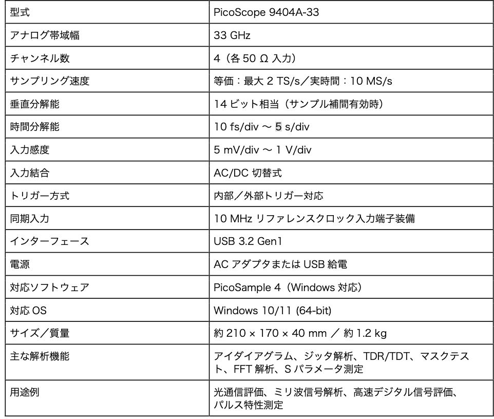 「PicoScope 9404A-33」は、33 GHzのアナログ帯域幅と最高2 TS/sの等価サンプリング速度を実現する高性能 USB サンプリングオシロスコープです。従来の据え置き型測定器に比べ、コンパクトな筐体ながら高い周波数特性と広ダイナミックレンジを兼ね備えており、光通信・ミリ波通信、RF/高速デジタル信号解析、パルス特性評価などの分野に適しています。