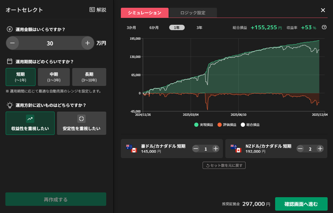 自動売買のポートフォリオが作成されると、自動売買のシミュレーションや設定が表示されます。内容を確認し、納得して自動売買を稼働することができます。