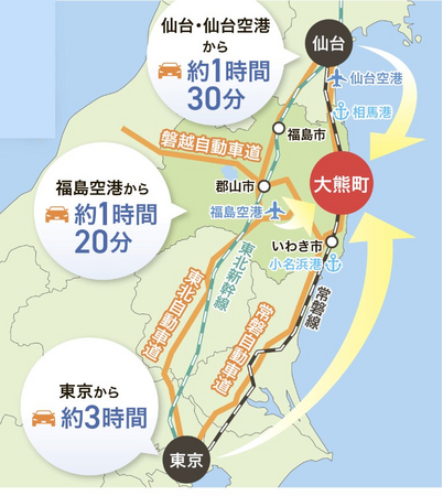 大熊町は仙台まで車で約1時間30分、東京まで車で約3時間。常磐自動車道大熊ICや福島空港・仙台空港などへのアクセスも良好です。