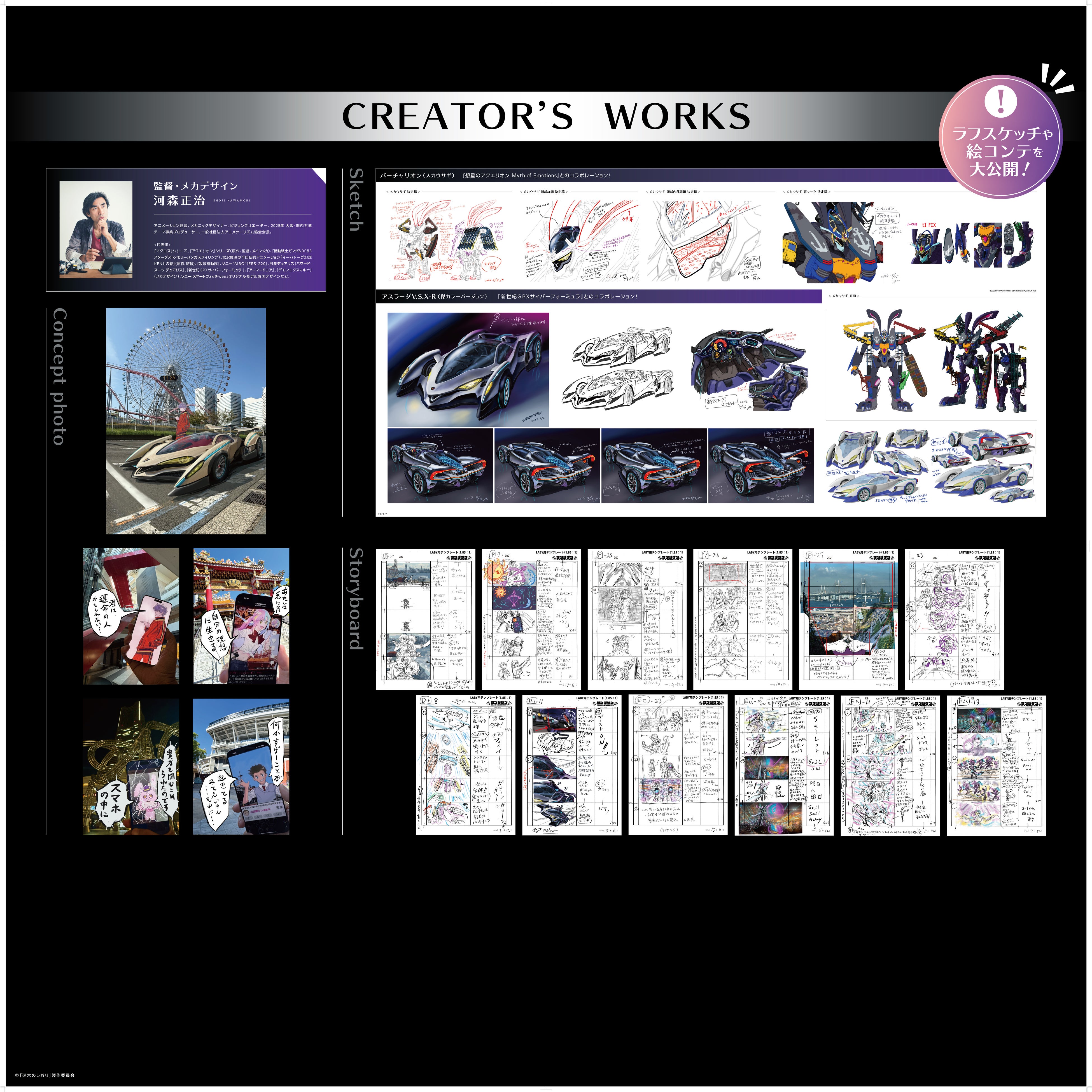 ▲ 河森監督による絵コンテ、メカデザイン設定などの資料を紹介するパネル