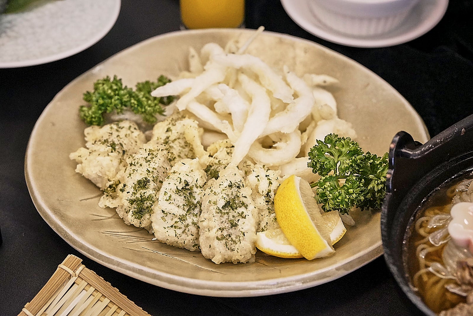 【華頂】にがり絹ごしの湯豆腐/鶏つみれの醤油ちゃんこスープ仕立て/白魚唐揚げと海老芋薄衣揚げ