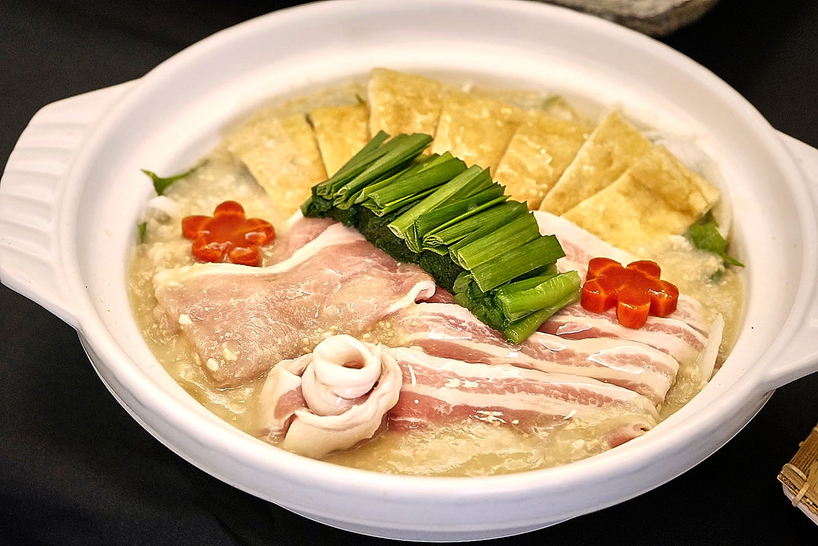 ・肉味噌ちゃんこ鍋(1月ディナー):鶏ガラ出汁に京都の白味噌と北陸の米麹味噌を絶妙なバランスで配合。京丹波高原豚、京都の老舗豆腐屋の油揚げ、京都近郊の香味野菜をオープンキッチンで仕上げます。京七味、柚子胡椒の風味が食欲をそそる一品。