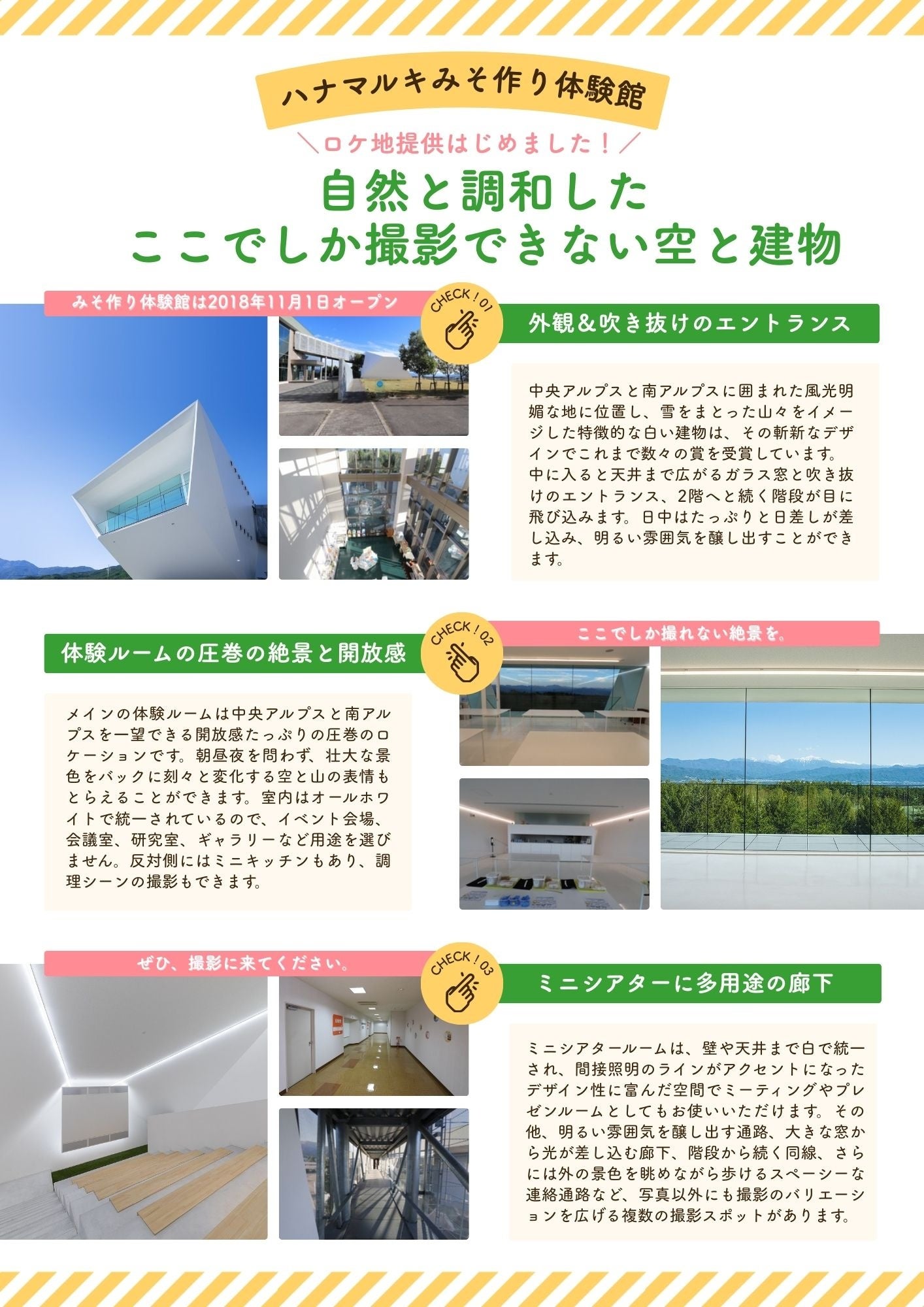 ハナマルキみそ作り体験館は、ハナマルキ創業100周年を記念して建設された未来的体験施設です。みそ作りを専門とする体験施設は国内でも珍しく、その独創的な建築デザインから、これまでにない新しい撮影スポットとして注目の物件です。最大の特徴は、南アルプスから中央アルプスまでを一望できる雄大な自然を背景に、雪化粧の山々を象徴するかのような真っ白で大胆な多面的デザインの外観。「近未来的」「異空間」「開放感」といったイメージがぴったりで、ドラマ、映画、CM、ミュージックビデオなど、ジャンルを問わず多様な撮影にマッチします。外観に加え、絶景を望む大窓が特徴の体験ルーム、シアタールーム、エントランス、廊下まで、可能な範囲でロケ地として提供いたします。