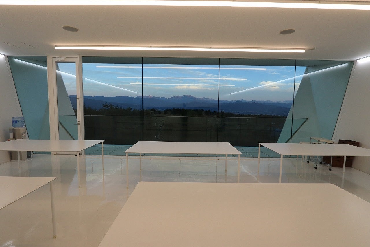 メインの体験ルームは中央アルプスと南アルプスを一望できる開放感たっぷりの圧巻のロケーションです。朝昼夜を問わず、壮大な景色をバックに刻々と変化する空と山の表情もとらえることができます。室内はオールホワイトで統一されているので、イベント会場、会議室、研究室、ギャラリーなど用途を選びません。反対側にはミニキッチンもあり、調理シーンの撮影もできます。