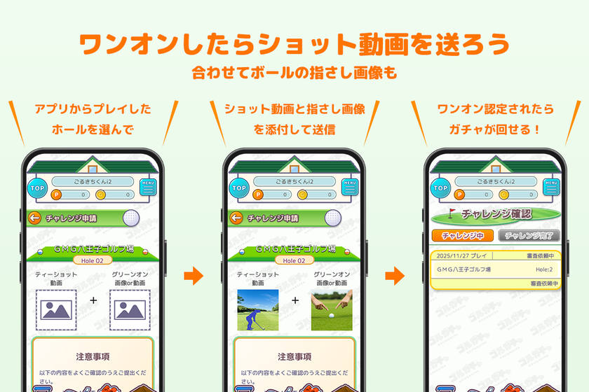 挑戦時はショットをスマートフォンで撮影しながらワンオンを目指します。いつものショットに緊張感と高揚感が加わり、まるでイベントプレーのように楽しめます。