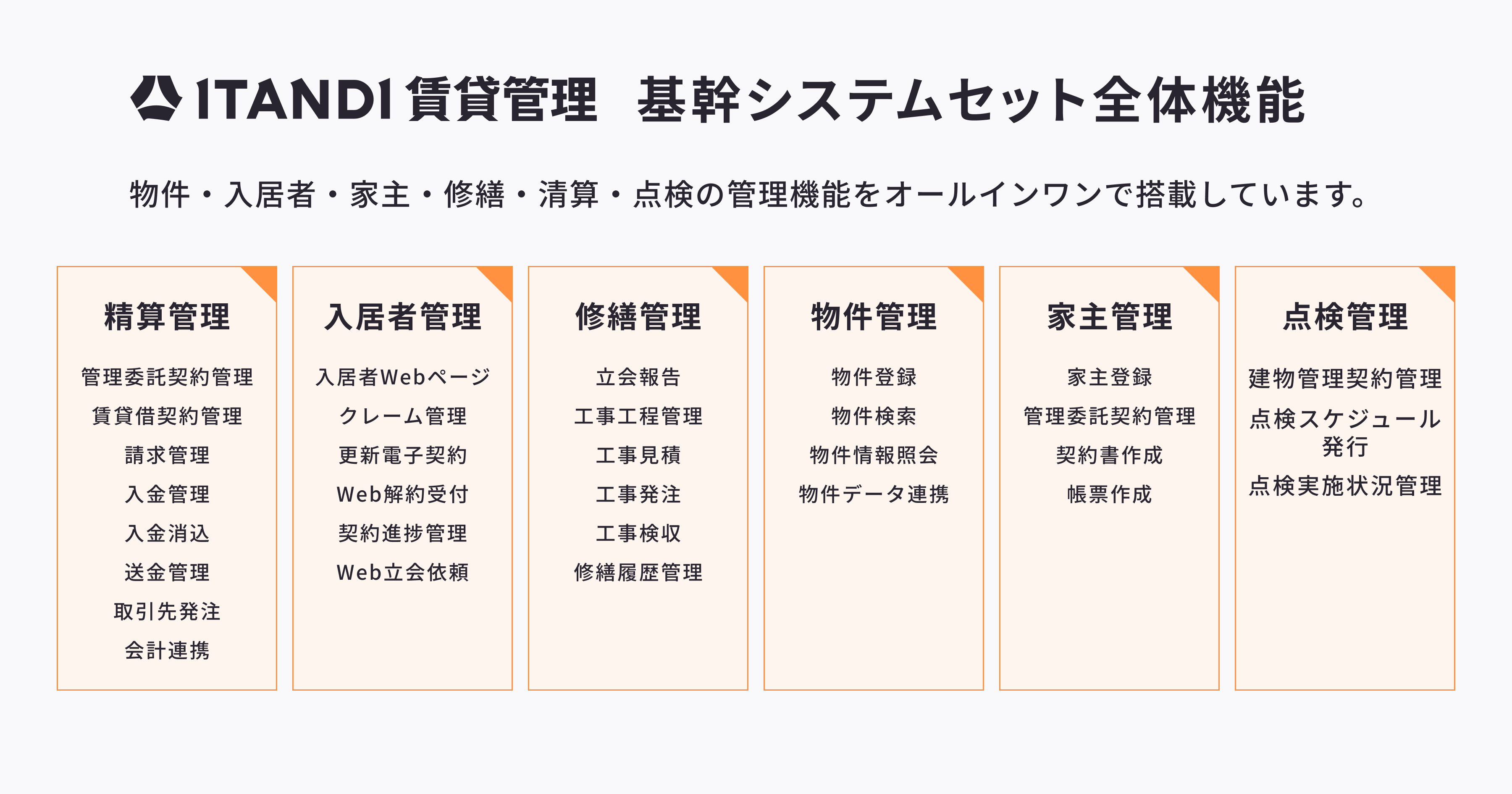 「ITANDI 賃貸管理」 基幹システムセットは、データ分析に基づく収益性と物件オーナーなどの顧客満足度の向上をコンセプトとし、賃貸管理業務における精算・物件・入居者・オーナー・修繕・点検の管理を一括して効率化する賃貸管理システムです。本システムで管理している情報は、全国賃貸入居申込の約40%で仲介会社に利用(※1)される、リアルタイム不動産業者間サイト「ITANDI BB」に自動で連動されるため、空室状況、賃料、設備情報などを常に最新の状態で仲介会社に届けることが可能です。