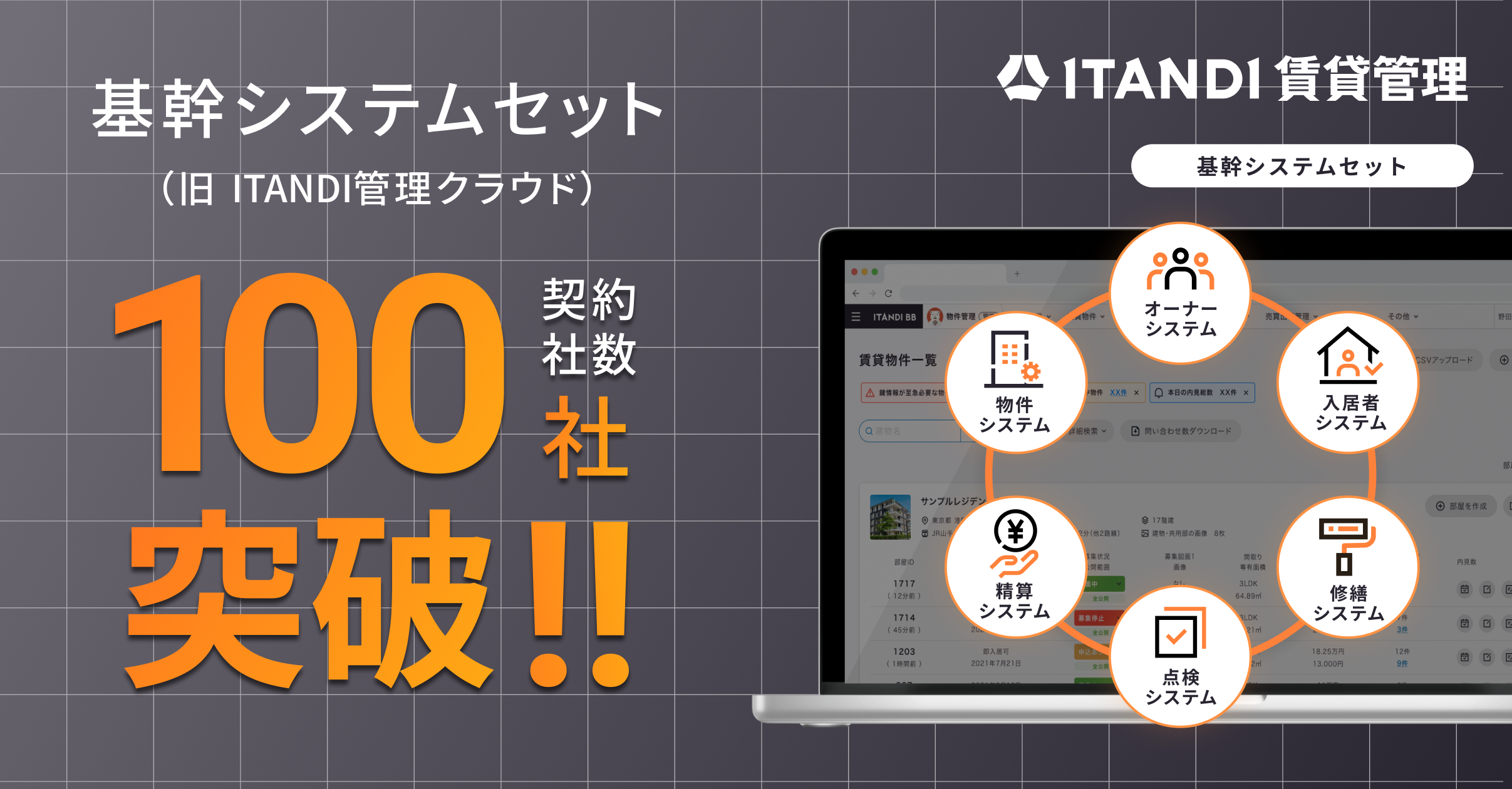 テクノロジーで不動産取引をなめらかにするイタンジ株式会社(以下「当社」)は、当社が提供する賃貸管理の業務支援サービス「ITANDI 賃貸管理」 基幹システムセットの契約社数が、100社を突破したことをお知らせします。