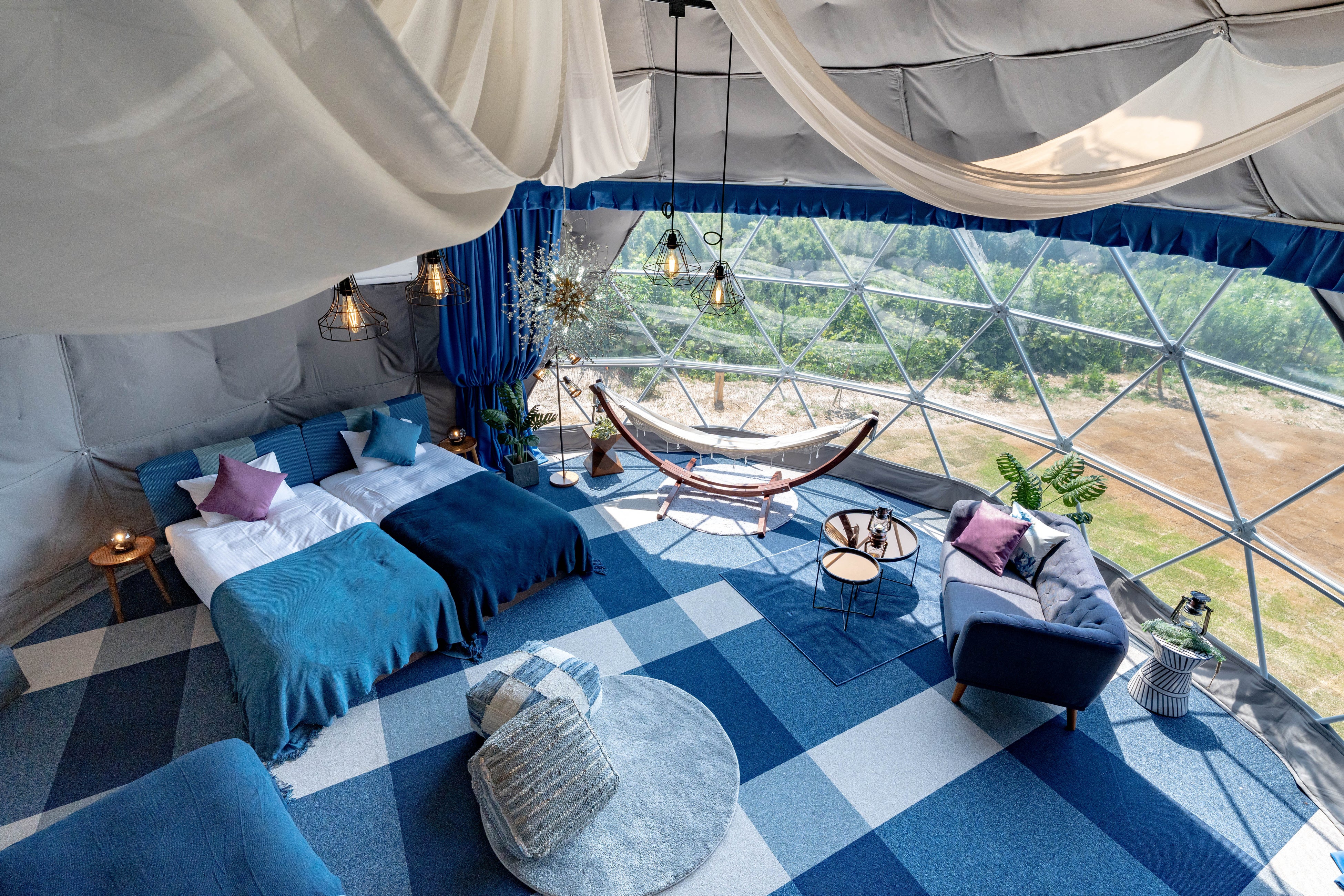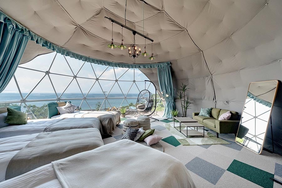 淡路島西海岸の人気エリアに位置し、夕方には水面に沈む美しいサンセットを眺めることができます。全4棟限定の大型ドームテントは7m超えの広々空間で優雅なリゾートステイを満喫できます。