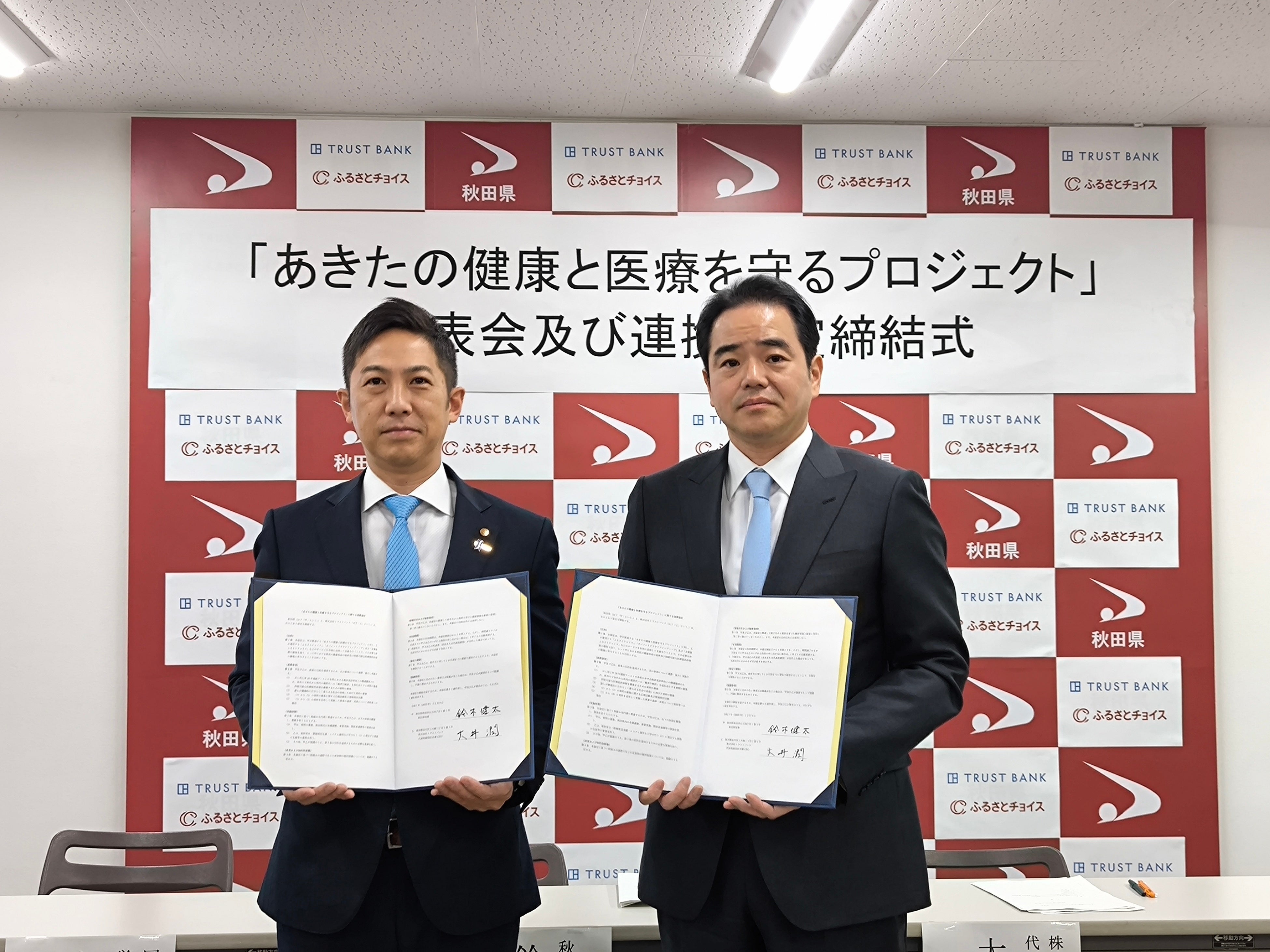 秋田県(知事:鈴木 健太、以下「秋田県」)と国内最大級のふるさと納税総合サイト「ふるさとチョイス」を企画・運営する株式会社トラストバンク(本社:東京都品川区、代表取締役社長兼CEO:大井 潤、以下「トラストバンク」)は、本日12月9日(火)、「健康・医療に関する連携協定」を締結したことをお知らせします。