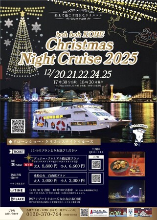 12月20日(土)~25日(木)(※23日は除く)、boh boh KOBE船上でクリスマスイベント『Christmas Night Cruise2025』を開催します!boh boh KOBEから歩いて10分のメリケンパークにも、クリスマスマーケット、イルミネーション、ドローンショーなどを楽しめる「Kobe Meriken Xmas - Christmas Drone Show」が開催!神戸港で特別なクリスマスを楽しみましょう♪