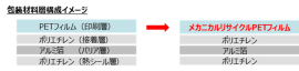 採用する包装材料は、外側から、PETフィルム、ポリエチレン、アルミ箔、ポリエチレンの順で各素材が層として重なっている材質構成となります。それぞれの素材の主な役割は順に、PETフィルムは印刷層、ポリエチレンは接着層、アルミ箔はバリア層、ポリエチレンは熱シール層となります。今回、最も外側で印刷層の役割を果たすPETフィルムをメカニカルリサイクルPETフィルムにすることで、印刷適性などの機能を損ねることなく製品化を実現します。