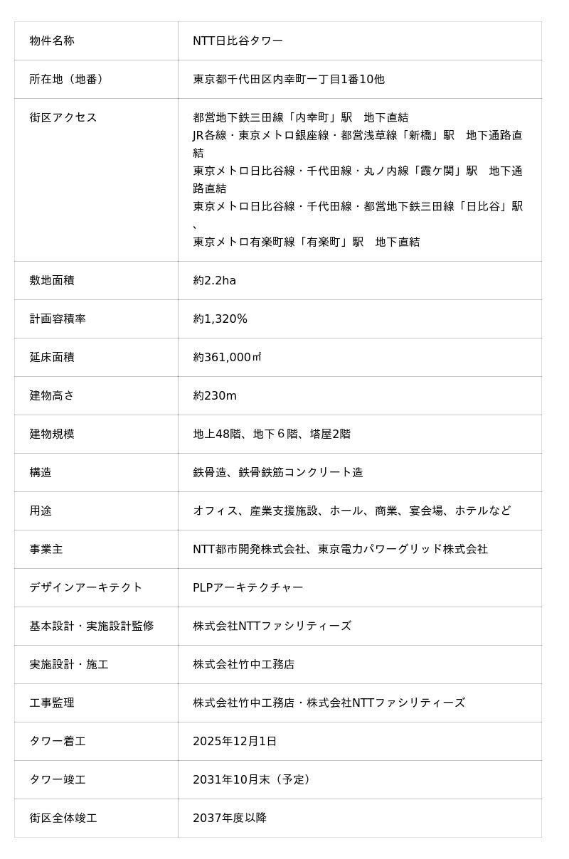 NTT都市開発株式会社(本社:東京都千代田区、代表取締役社長 池田 康、以下「NTT都市開発」)および東京電力パワーグリッド株式会社(本社:東京都千代田区、代表取締役社長 金子 禎則、以下「東京電力パワーグリッド」)は、東京都千代田区にて「NTT日比谷タワー」(以下「本タワー」)が2025年12月1日(月)に着工したことをお知らせします。なお、竣工は2031年10月末を予定しています。