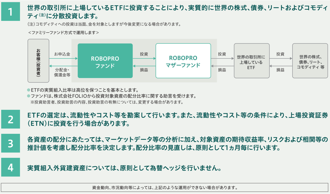 当ファンドは、株式会社FOLIOホールディングスの子会社である株式会社FOLIO (本社:東京都千代田区、代表取締役:四元盛文、以下「FOLIO」)が「ROBOPRO(R)」の運用戦略に基づいて投資助言を行い、SBI岡三アセットマネジメントが運用を行っております。