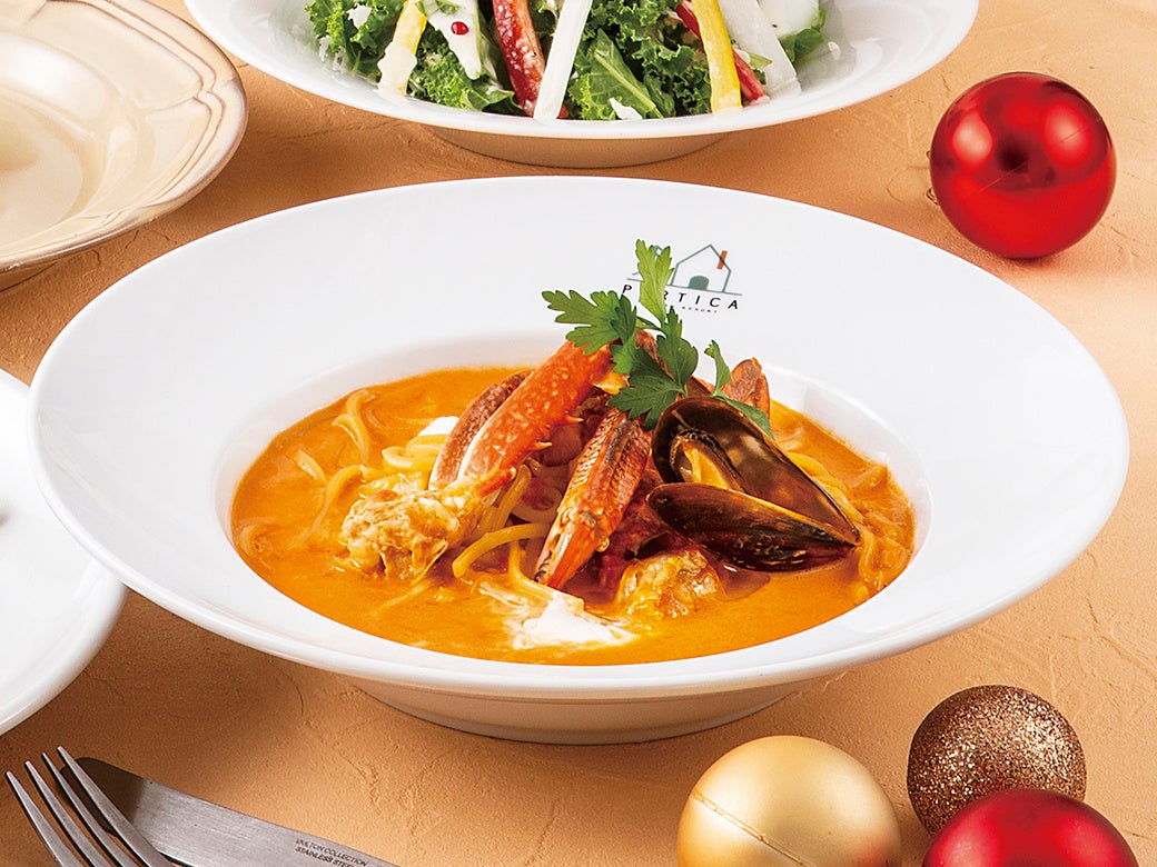渡り蟹、ムール貝の旨味を濃厚ビスクスープで閉じ込めた絶品スープパスタ『魚介のビスクスープパスタ』をご提供。